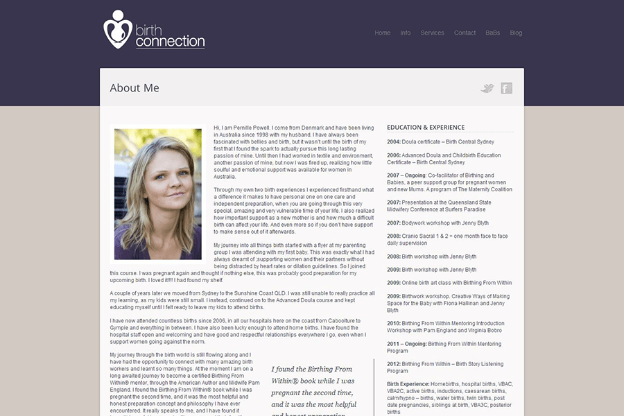 I have made two websites for Birth Connection, the most recent of which is a WordPress based design. It’s a work in progress, as most sites are, but I think the colour palette is beautiful and the design is classy and classic. I also provided a number of my images for the site and sourced some others from stock libraries.